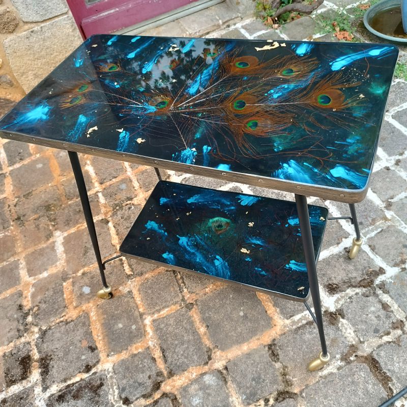Les plateaux ont été recouvert d’une résine sur fond noir avec des plumes de paon et des effets avec des pigments bleu ainsi que des feuilles d’or.