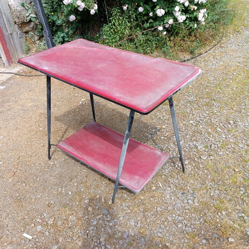 Transformation d’une petite table vintage en simili cuir rouge sur roulettes très 70’s.