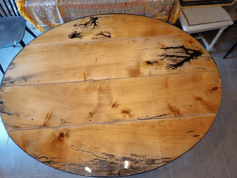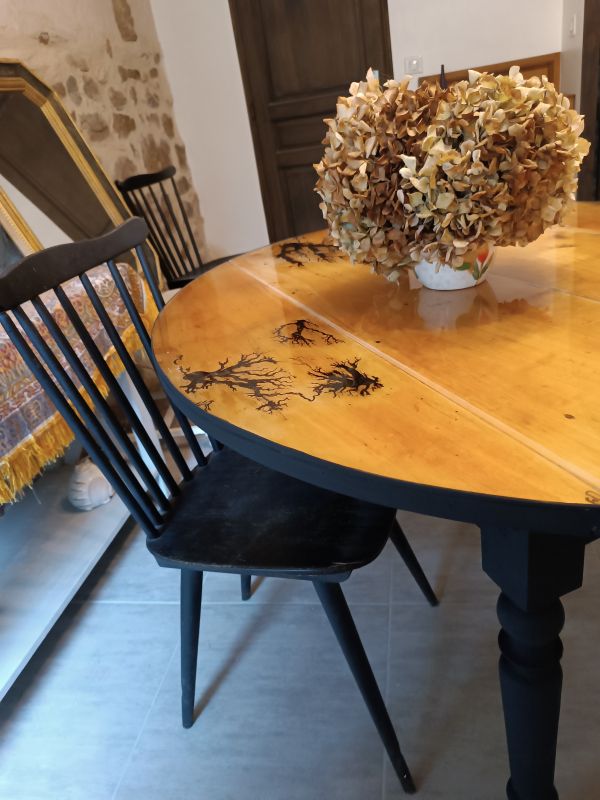 Mon client voulait conserver la table de sa grand mère, tout en lui donnant un côté plus contemporain, alors la résine avait sa place dans la rénovation.